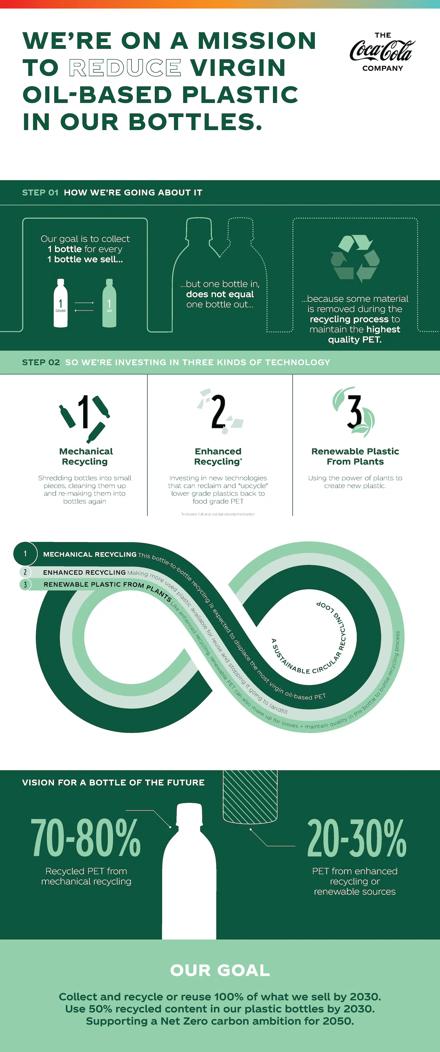 As part of its World Without Waste vision, Coca-Cola is working to make all its packaging more sustainable, including maximizing use of recycled and renewable content while minimizing use of virgin, fossil material. The company has pledged to collect back the equivalent of every bottle it sells by 2030, so none of its packaging ends up as waste and old bottles are recycled into new ones; to make 100% of its packaging recyclable; and to ensure 50% of its packaging comes from recycled material.