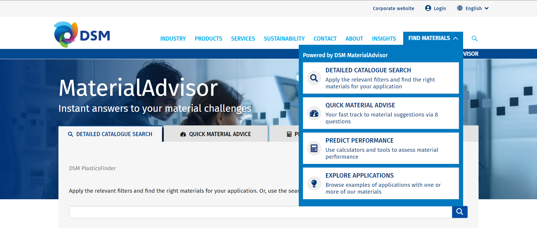- QuickAdvisor, providing an initial, quick online material assessment in the early stages of a design process, based on the answers to eight questions. The tool exists alongside DSM’s well-known, data-rich, and property-based product catalog, PlasticsFinder.