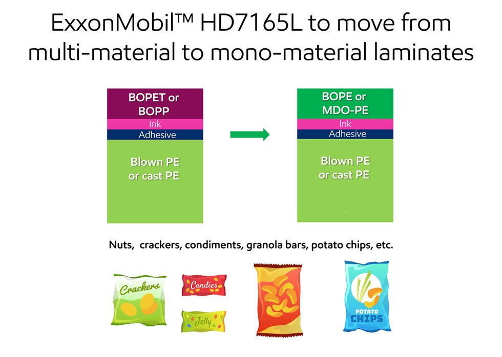 ExxonMobil has developed a novel high density polyethylene (HDPE) grade, ExxonMobil HD7165L, for Machine Direction Oriented (MDO) PE film applications. Designed for recyclability, HD7165L can help converters create mono-material laminates to replace multi-material laminate structures which can be difficult to mechanically recycle.