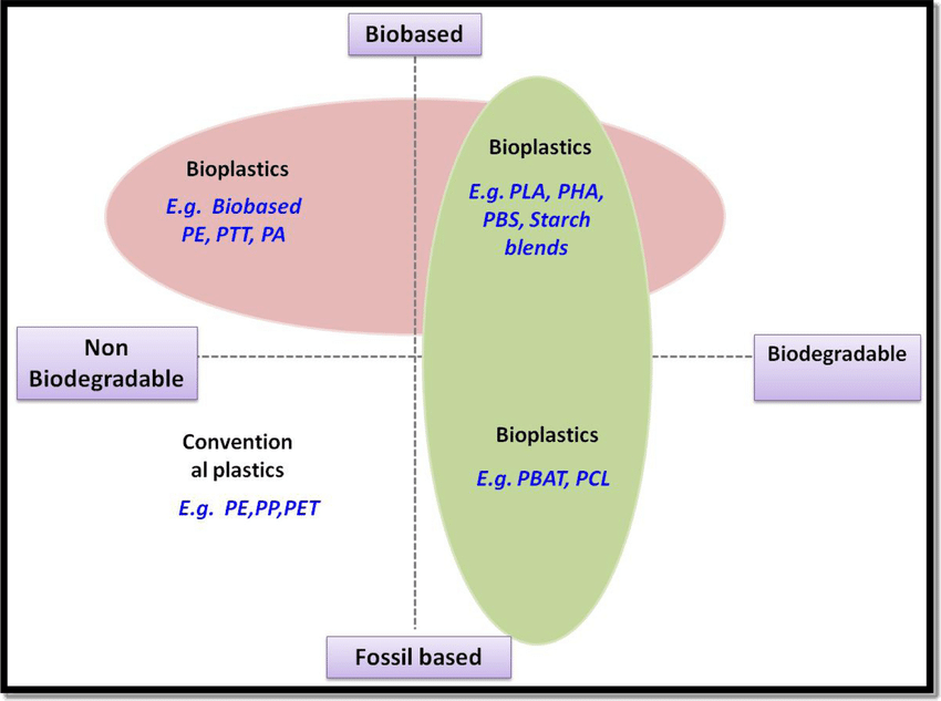 1. Bioplastics that are based on renewable resources and are biodegradable, like starch, cellulose, proteins, lignin, Polylactic acid (PLA), Polyhydroxyalkanoates ( PHAs), poly hydroxybutyrate ( PHB),
