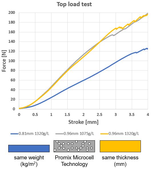The example above illustrates the new potential. The thermoformed PET tray foamed with Promix Microcell Technology (grey) shows the same mechanical top load properties as a solid tray (yellow) but is 18 % lighter. The non-foamed benchmark tray that is also 18 % lighter (blue) shows however significantly reduced top load properties. This example documents that the Microcell Extrusion Technology is an effective way to save up to 20 % raw materials without compromising mechanical properties and is in addition reducing energy consumption and environmental footprint. The internal and external recyclability remains 100 % intact and is equivalent to the non-foamed products.