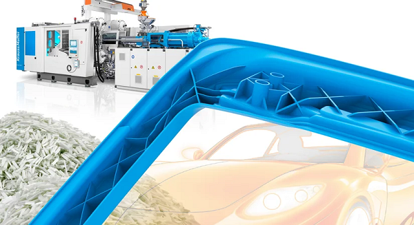 Compared to traditional processes using pre-compounded long glass fiber granulate, the CFP technology enables separate dosing of PP and glass fibers. Both components can be supplied directly via the machine’s conveyor system, homogenized in the cylinder, and processed particularly gently with the help of the new CFP screw. This offers the advantage that no fiber clusters are formed during processing, thus ensuring optimum component properties at significantly lower material costs.