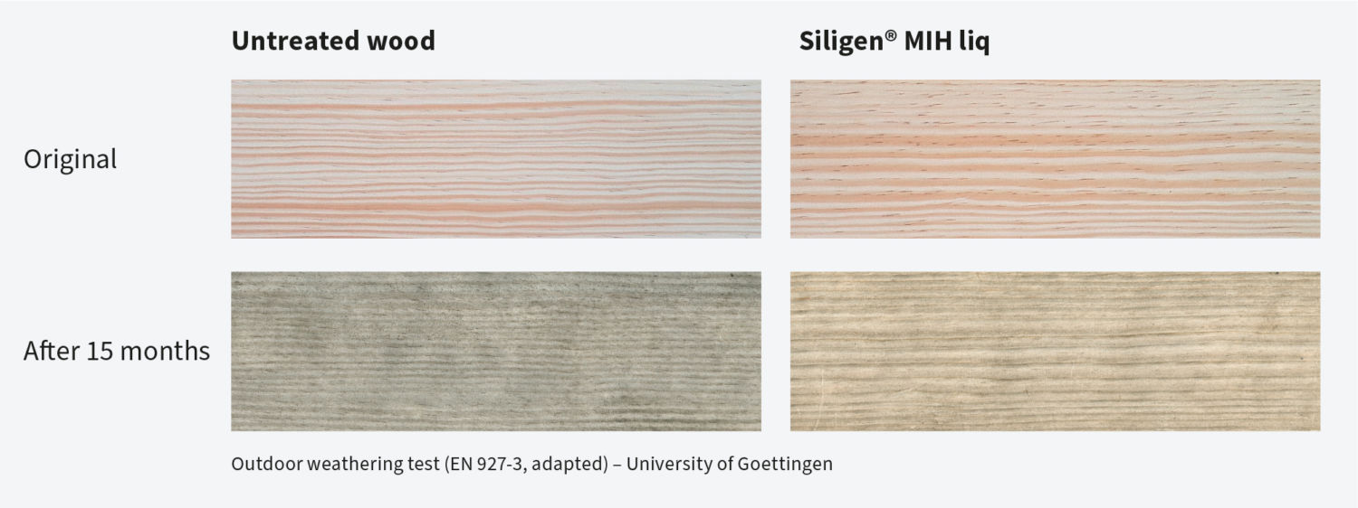 Wood treated with Siligen® MIH liq shows excellent protection against decay fungi. Treated wood displays improved weathering performance and keeps its natural appearance with less discolorations and change in feel.