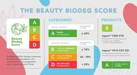 Next to developing the new biodegradable Jaguar ingredients, Solvay experts created the Beauty Biodeg Score chart based on the OECD guidelines ranging from A to D. The two new ingredients Jaguar NAT SGI, a readily biodegradable thickening polymer (score A), and Jaguar Excel, an inherently ultimately biodegradable conditioning polymer (score B), meet the toughest criteria for biodegradability.