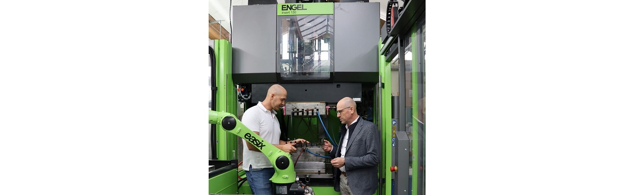 The ENGEL Group, Europe’s leading provider of injection moulding technologies, has provided the Rosenheim University of Applied Sciences with a state-of-the-art injection moulding cell. This system, comprising an ENGEL insert 500V/130 vertical injection moulding machine, an ENGEL infrared oven, and an ENGEL easix KR-10 articulated arm robot, is being used in the university’s teaching and research. There is a particular focus on the processing of thermoplastic, recyclable composites as well as the application of natural fibres.