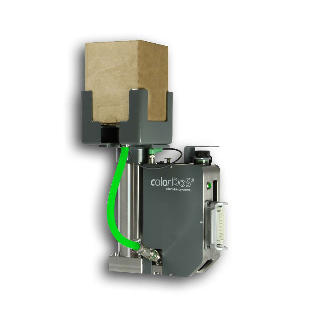 The compact dosing system colorDoS was specially developed by HNP Mikrosysteme for this task. The system is installed on the injection molding machine (SGM) above the screw conveyor and doses the liquid color directly into the flow of granules. colorDoS contains, among other things, a micro annular gear pump, a dosing nozzle, and intuitive display control. The integrated pump ensures exact dosing and high color fidelity with minimal color addition. A modular micro annular gear pump mzr-7245 is used. Depending on the dosing time and the viscosity of the paint, the pump achieves a dosing volume of 0.02 to 100 g of paint per shot.