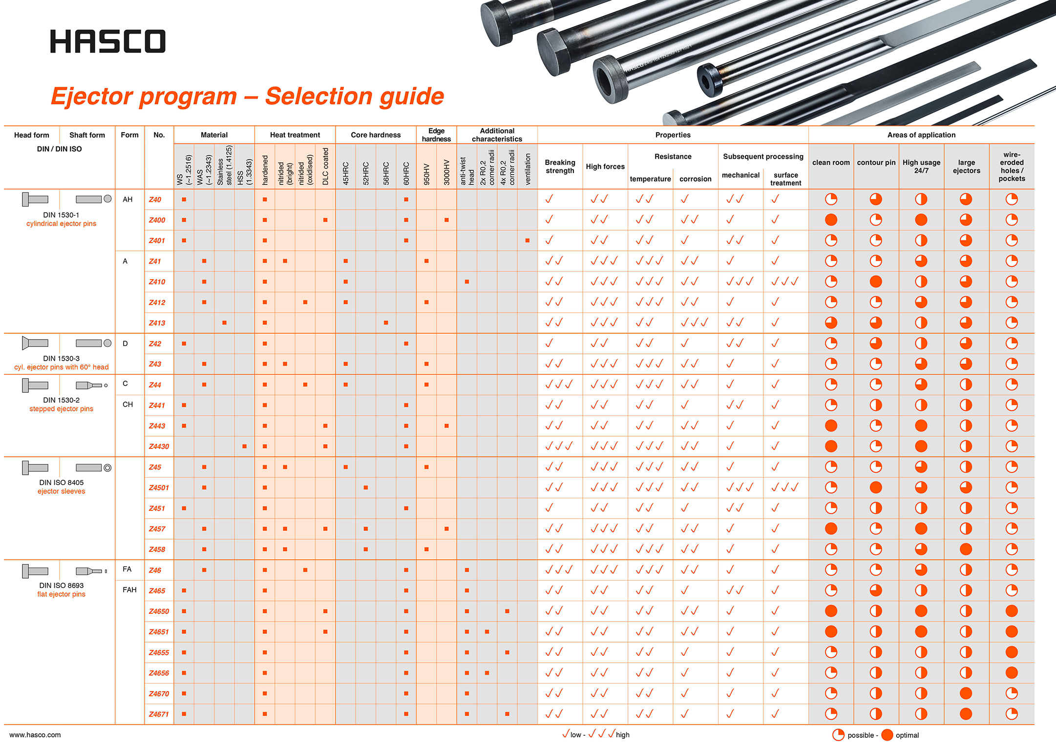 The interactive selection table is available in the media library on the HASCO website. Here, information on the properties and fields of application of the different versions can be found in the overall view. The technical properties provide details of the specific areas of application for the respective ejector pins.